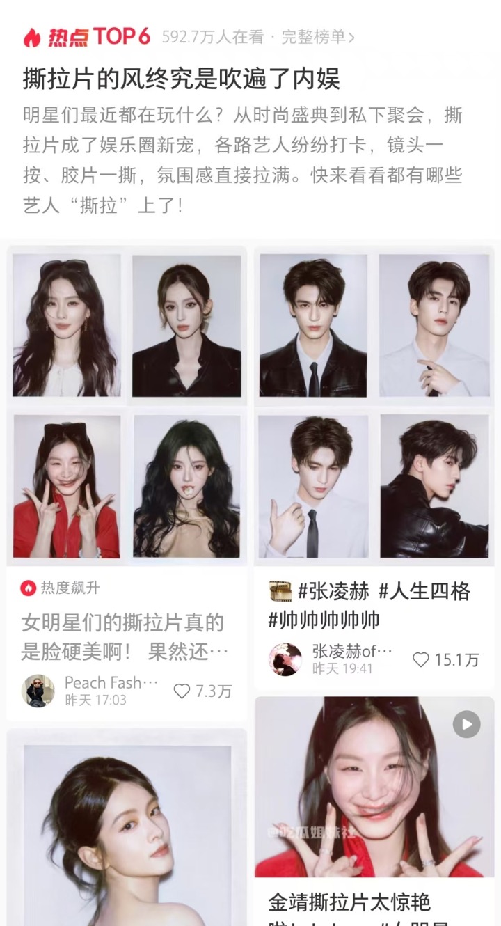 最近,鞠婧祎、刘诗诗、虞书欣、古力娜扎、张凌赫、金靖等一众明星拍摄的撕拉片在网上火爆出圈。拍完当场显影的方式,也被认为少了“中间P图”环节,最能还原明星美貌,成为新的明星美貌营销神器。除了“原图直出”,还有不少明星晒出撕拉片的拍摄花絮视频,向网友介绍其玩法。
